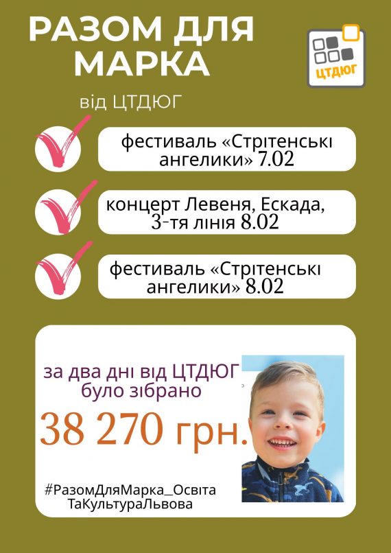 У Львові триває благодійна акція на підтримку 3-річного Марка Гладиша. Працівники ЦТДЮГ долучились до ініціативи департамент освіти і культури Львівської міської ради щодо цього збору.